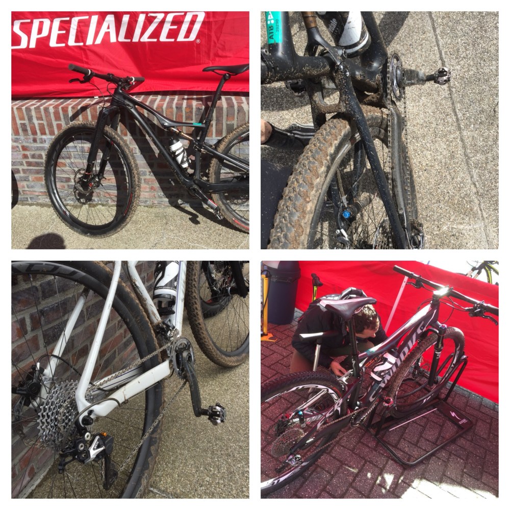 Voor mij stonden in het kader van Test-The-Best een Era, een Fate en een Epic (WorldCup!) klaar om uit te proberen op het parcours van enkele kilometers door het Montferlandse bos. Ik was erg benieuwd. Allereerst omdat ik nog nooit op een 29er had gefietst en daarnaast omdat ik alleen maar een hele slechte ervaring had met een full suspension. Het tentje met testfietsen zag er in eerste instantie niet zo spectaculair uit, vooral omdat vrijwel alle testfietsen in stemmig zwart waren uitgevoerd en nog vol modderspatten zaten van de testritjes van de ochtend. Dat oogde allemaal niet echt flitsend. Toen echter mijn eerste testfiets werd afgesteld op mijn lengte en gewicht en ik luisterde naar alle specificaties van de Era, die ik ging uitproberen, besefte ik dat ik daadwerkelijk mocht rondcrossen op een MTB, die ik mezelf waarschijnlijk nooit kon veroorloven.
