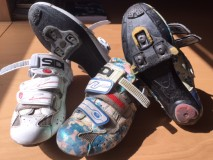 Het was wel lang geleden dat ik op mijn oude Trek had gereden en ik was de poort al uit, toen ik bij het inklikken ontdekte dat deze schoenplaatjes niet op deze pedalen pasten. Heel even dacht ik de ultieme smoes voor vandaag gevonden te hebben, toen ik me realiseerde dat ik ook de oude schoenen hiervoor had bewaard. Snel dus weer naar binnen en de andere schoenen opzoeken en aandoen. Intussen was het zo laat dat het niet echt mogelijk meer was om rustig mijn eten te gaan verteren. Er moest doorgefietst worden om nog op tijd te zijn. Het ging allemaal erg stroef. Ik moest wennen aan de zit op mijn oude fiets, het zadel kraakte hoogst irritant en ik had een fikse wind tegen. Ik vond dat ik, toen ik Zevenaar bereikt had, eigenlijk al wel genoeg gedaan had, maar de training zelf moest dus nog beginnen. Gelukkig stond er een leuk groepje op de startlocatie en werd het stukje naar de dijk nog relatief rustig afgelegd, zodat ik de knop kon omzetten. Gaan!