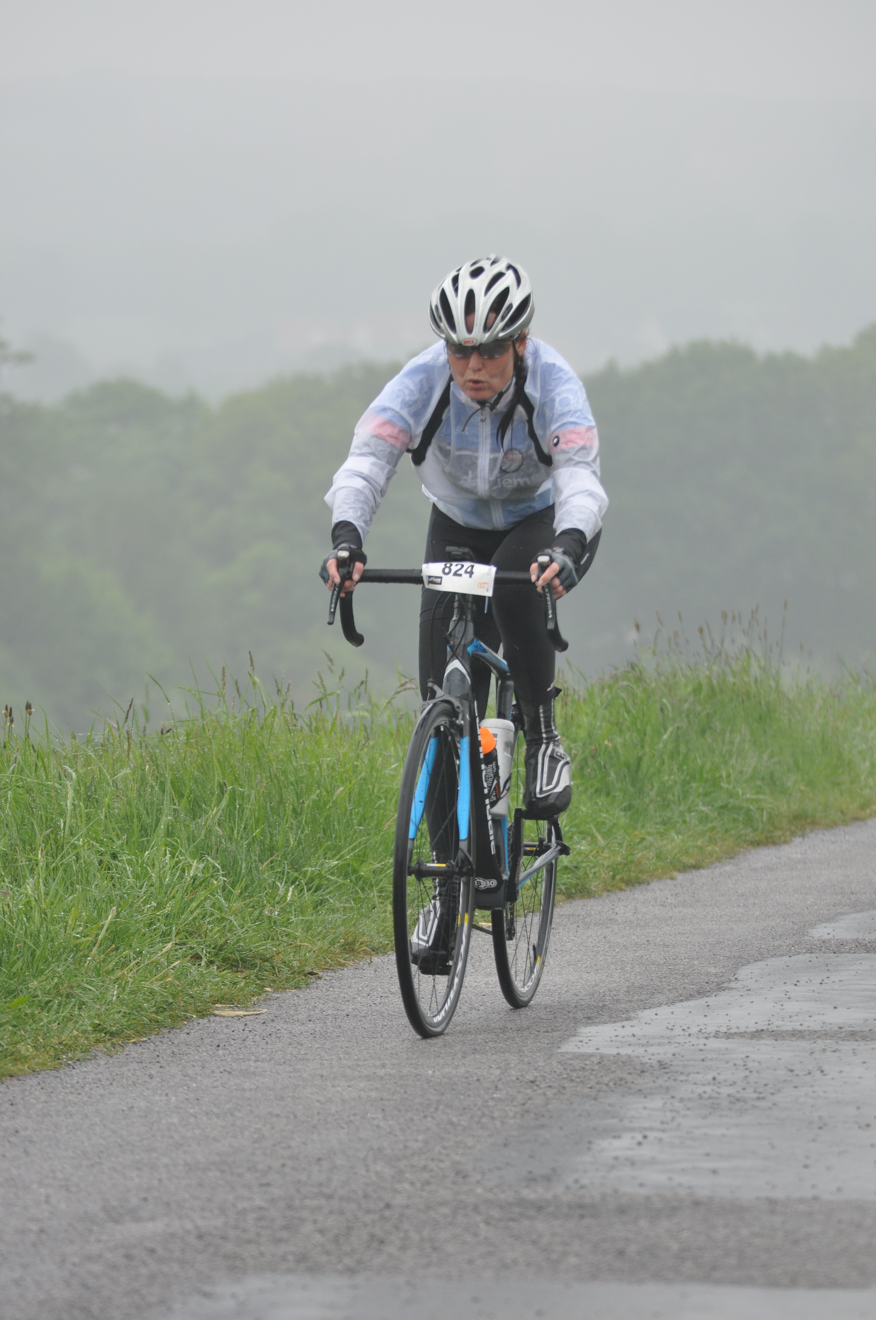 We vonden een mooi parkeerplekje vlakbij de start en na moedig inschrijven voor de langste afstand van 160 kilometer gingen we gewapend met een extra bidon gesponsord door SportvoedingWebshop onder redelijk droge omstandigheden op weg. Al gauw begon het te miezeren. Je zou kunnen zeggen dat we onderweg inderdaad één bui hebben gehad, die afwisselend bestond uit miezerregen, gedruppel, gespetter en regen. Deze bui hield de hele dag dapper vol. Ik was vertrokken met overschoenen aan en heb onderweg afwisselend mijn windstopper en mijn regenjasje aangehad, maar uiteindelijk had ik behalve mijn ondershirt en BH niks droogs meer aan mijn lijf. Zelfs mijn schoenen en sokken waren doorweekt. Deze omstandigheden maakten de toch al pittige rit extra zwaar.