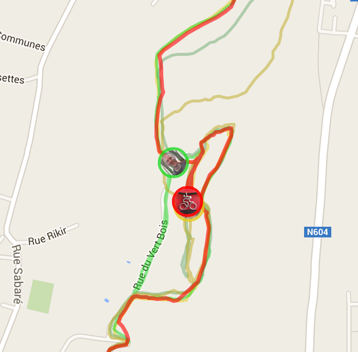 De route was uitstekend gepijld, maar bij het ‘Bois de Julienne’ hadden we toch even de nodige moeite, zoals nadien ook op de flyby van strava bleek. Er waren wat lastige stukjes afdaling tussen de bomen, die nogal steil waren af en toe. Er zat een heuse ‘kuil van Haaksbergen’ tussen, die ik zonder al te veel nadenken probleemloos nam. Tijd om uitgebreid trots op mezelf te zijn was er nog even niet, want het was erg opletten daar. Norbert en ik twijfelden bij een splitsing of we rechts naar beneden moesten of rechtdoor. Een snelle beslissing deed ons rechtdoor fietsen achter een andere deelnemer aan, maar Norbert kreeg de melding op de Garmin dat we van koers waren. Tegelijkertijd vroegen we ons af waar Wilfried was. We waren in de veronderstelling dat hij nog voor ons zat en ook rechtdoor gegaan was, maar na een paar pogingen om hem te bellen bleek hij al beneden te staan, ergens na een roodwitte slagboom. Omkeren dan maar en dus toch dat gat in duiken. Eenmaal terug bij de gemiste afslag was er net een groep aan het klungelen om dat steile pad naar beneden te komen. Ik zag er al wat tegenop om daar naar beneden te sturen, maar het feit dat al die mannen daar gingen lopen bracht me nog meer van mijn stuk. Dat lopen zag er bij nader inzien nog ingewikkelder uit dan fietsen en ik zag het even helemaal niet zitten. Een handige fietser met een Vlaamse tongval liet me zien dat het toch ook best fietsend kon en moedigde me even aan: “Gewoon achterop het zadel, gaat best” en dat was net even nodig om het knopje bij mezelf om te zetten. Die fiets op en gaan! Ging prima en eenmaal bezig was het stiekem gewoon leuk. Beneden aangekomen zagen we al snel de genoemde roodwitte slagboom, maar blijkbaar hebben we daar alsnog ergens een pijl gemist, want er kwamen op de plek, waar Wilfried uiteindelijk op ons stond te wachten, zowel mensen uit een pad van boven als achter ons aan.