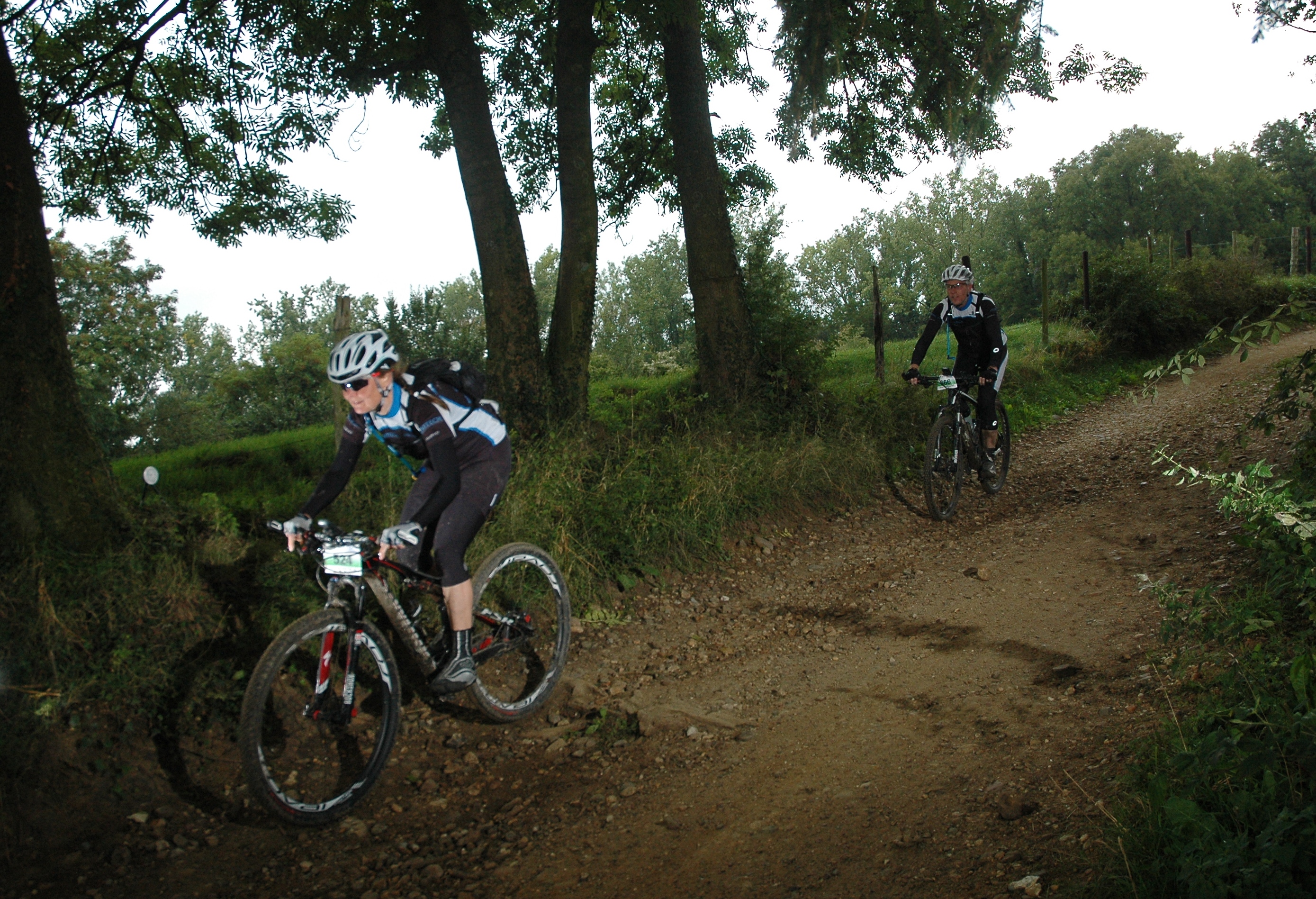 Aangekomen in het weiland nabij Libeek, dat als parkeerplaats was ingericht, kon ik nog steeds niet echt zeggen dat ik er veel zin in had. Het was echter droog en het gezelschap van Theo, Wilfried, Norbert en Edwin was prima. Ook heel fijn was het feit dat er zelfs op dat parkeerterrein al toiletten waren, zodat ik enigszins op de automatische piloot maar toch vrij vlot klaar was voor de start. In de tent bij start/finish was er een gemoedelijke sfeer en na wat prutsen met speldjes en tiewraps om zowel een stuurbord als een rugnummer te bevestigen konden we op weg. In het begin kon nog redelijk om modder en plassen heen gestuurd worden, maar al snel bleek dat er toch behoorlijk zompige delen in het parcours zaten, die de nodige behendigheid vergden op de vroege morgen. Ik baalde ervan dat ik geen tijd had gehad afgelopen week om andere banden te monteren, zodat ik met amper profiel op de ‘fast-trak’ voor en nog minder profiel op de ‘renegade’ achter de nodige moeite moest doen om niet ergens op een schuin lopend modderpad met fiets en al onder het prikkeldraad door te glijden. Er was ook een pluspuntje aan het weinige profiel: met wat minder lucht in de banden had die leemachtige grond niet veel kans om zich permanent vast te hechten tussen de noppen, waardoor mijn geringe grip in de loop van de dag in ieder geval niet nog verder afnam.