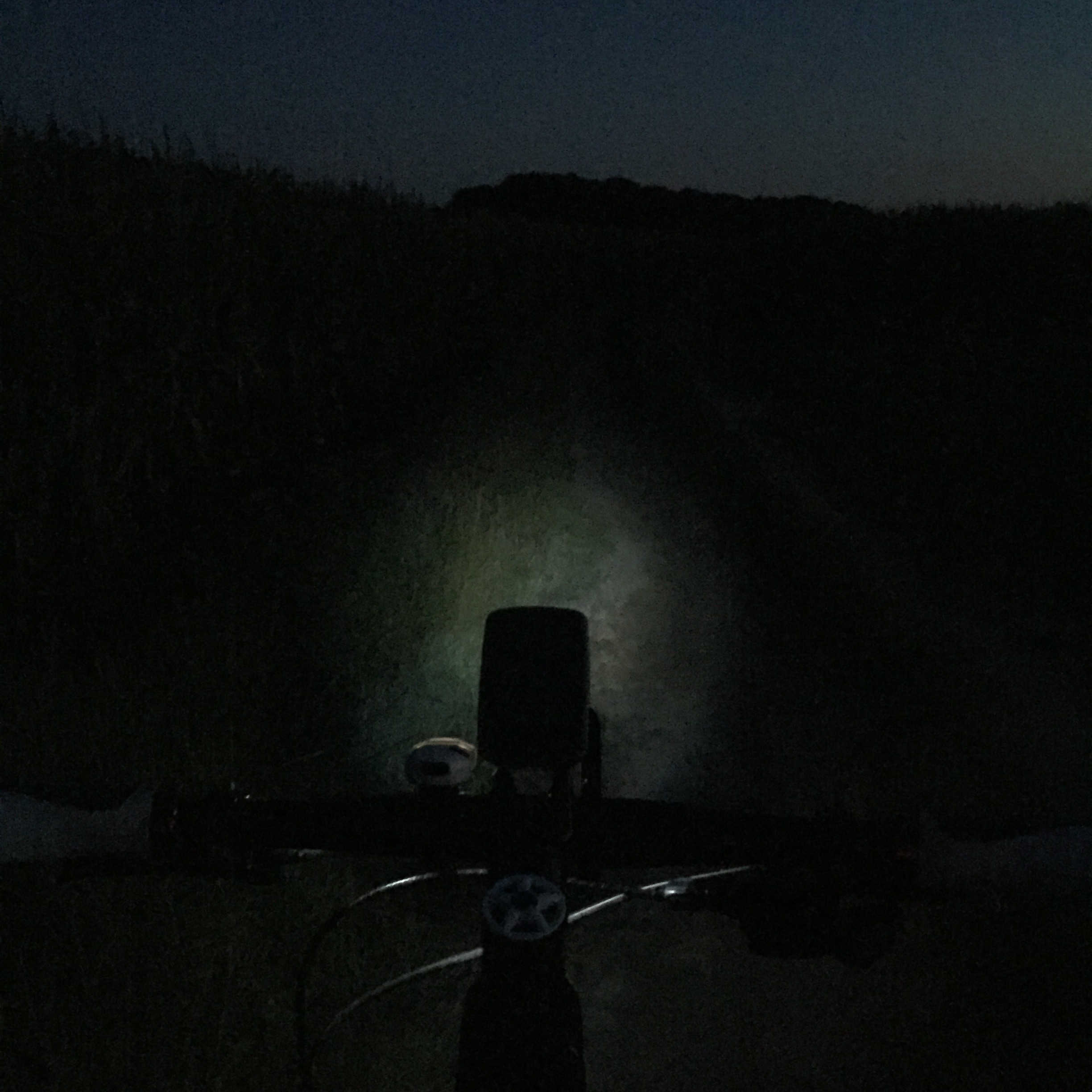 We hadden afgesproken dat we bij pech het thuisfront zouden kunnen bellen voor een ophaalservice, zodat we niet op achteraf gelegen weggetjes in het donker zouden hoeven klooien. Heel even overwoog ik of mijn gedoofde lampje zo’n calamiteit was. Het gemiezer zette echter niet door en de Singfire gaf dusdanig genoeg licht voor twee, dat we het aandurfden om gewoon door te rijden naar het huis van mijn collega. Die vond het overigens nog wel ergens onder het rijden even nodig om ‘grappig’ te doen door zijn lamp onverwacht enkele seconden te doven. Dit veroorzaakte ongetwijfeld de enorme spike in mijn hartslaggrafiekje van deze rit op strava. Wat was het donker zonder verlichting! Ik kreeg zijn ‘bamilamp’ mee voor het laatste stuk door het Montferlandse bos naar huis. De lamp bleek gemakkelijk over te zetten: de koplamp zelf ging met een elastiek op het stuur en met behulp van klittenband kon de accu aan mijn bovenbuis bevestigd worden. Na de koplamploze periode voelde ik me nu opeens verschrikkelijk zeker met deze felle lamp en ik durfde behoorlijk door te trappen op de fietspaden door de bossen. Het voelde alsof ik door een tunnel van licht reed, met juist donker in plaats van licht aan het eind ervan. Dat einde schoof steeds opnieuw voor me uit en ik bepaalde daarvan de snelheid. Buiten mijn tunnel bevond zich een mystieke wereld, die vooral op de open plek in het bos prachtig was. De eerste mistflarden van die nacht kringelden zich om de poten van de oerrunderen. Deze mistflarden staan in deze omgeving bekend als ‘witte wieven’. Ik genoot van de natuur en de rust en ik voelde me koningin van de nacht.