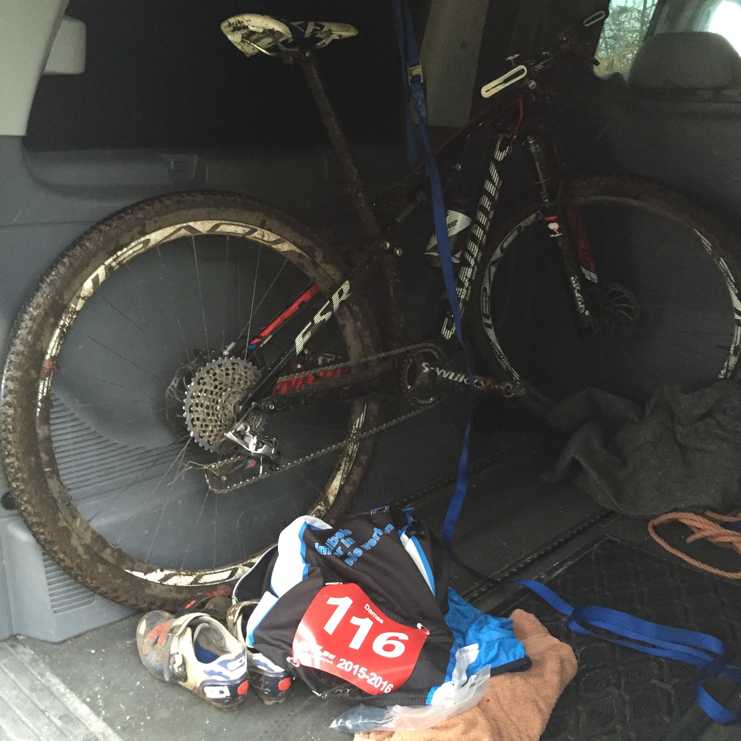 Zo speldde ik mijn nummer op mijn shirt en zocht ik een plek voor de transponder. Ik had als advies gekregen om dat ding aan mijn schoen of aan mijn voorvork te maken, maar mijn sidi’s leken niet veel houvast te bieden en de voorvork van mijn Epic leek wat dik. Uiteindelijk met hulp van een aardige meneer, die mij zag mutsen, heb ik dat ding toch aan mijn voorvork gekregen. Ik had geen idee wat te verwachten en ook geen idee van mijn eigen kunnen en dat maakte het verschrikkelijk spannend. Alle vrouwelijke deelnemers, behalve de jeugd, vormden één competitiegroep en ik had van tevoren visioenen gehad over hoe ik als oud wijf op mijn mountainbike links en rechts zou worden ingehaald door kleine meisjes op cyclocrossers. Ik had bedacht dat ik heel hard ging proberen om in elk geval geen laatste te worden en het verder als een experiment te beschouwen om te zien of ik het überhaupt leuk zou vinden.
