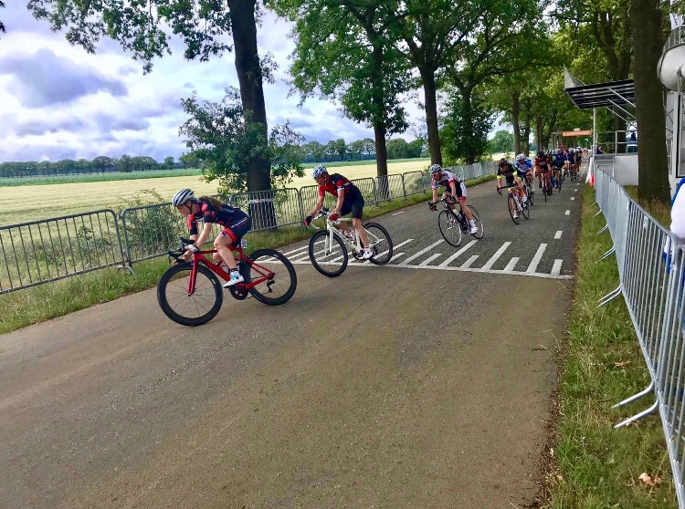 Ik heb genoeg van de rafelige wegkant en besluit een volgende ronde een andere tactiek uit te proberen. Het gaat niet echt hard tegen de wind in, waardoor ik het lef heb om er vol door de wind rechts langs te steken, zodat ik mooi voorin na de start/finish het smalle deel op kan draaien. Dit werkt, maar zulke goede benen om zo met mijn krachten te kunnen smijten heb ik nou ook weer niet. Een ronde later vind ik de sleutel: een andere vrouw past mijn dwars-door-de-wind passeertechniek van zojuist toe en ik pak haar wiel om mee naar voren te liften. Zo zet zij mij onbedoeld een aantal ronden op rij keurig af in vierde of vijfde positie voordat het smalle gedeelte begint.