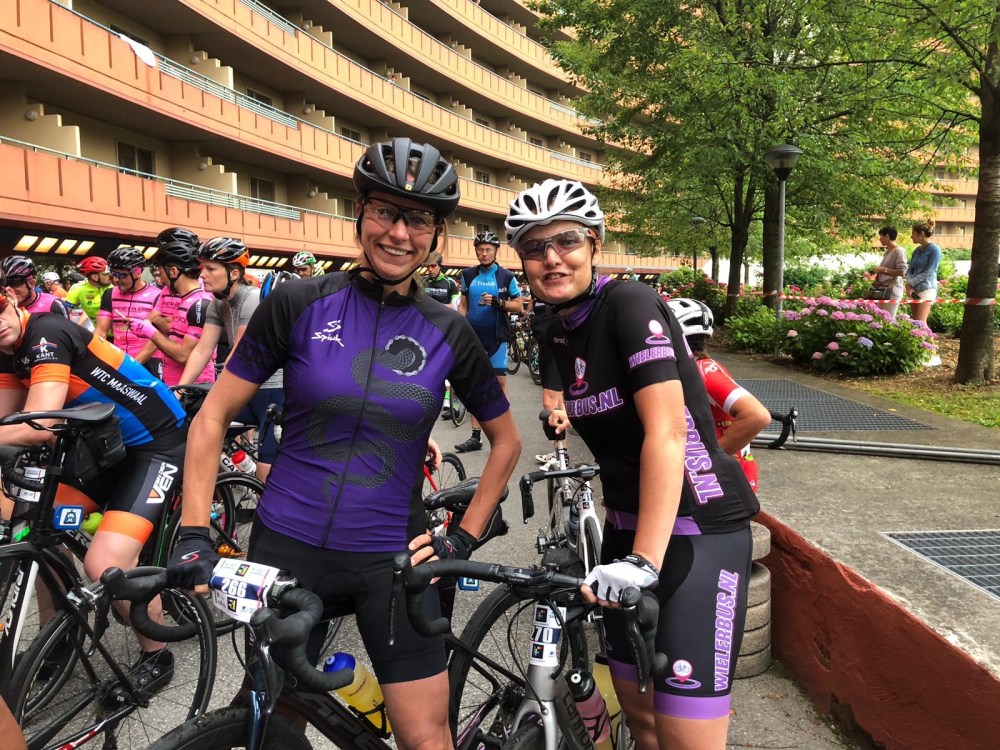 Vanaf het moment dat ik uit het hotelbed stap, heb ik het idee dat het thema ‘blijf bij de groep’ van start gaat. Ondanks mijn zorgvuldige voorbereiding moet er die ochtend nog van alles, dat meer tijd kost dan gepland. Het begint al bij de lange rij bij het extreem langzame koffie-apparaat tijdens het overigens verder prima verzorgde ontbijt en eindigt via een uiterst trage lift om mijn tas op de tiende verdieping nog op te halen bij een toiletbezoek dat niet opschiet, omdat ik ontdek dat ik opeens ongesteld ben. Ik heb wel tampons bij me, maar die zitten nog in mijn tas. Ik moet nog een extra keer heen en weer. Met tassen, bidons en fietsschoenen in mijn hand ren ik uiteindelijk op mijn sokken de parkeerplaats over, waar iedereen al in de Wielerbus zit, die ons stipt om zes uur naar de start zal brengen. Dat begint al lekker.