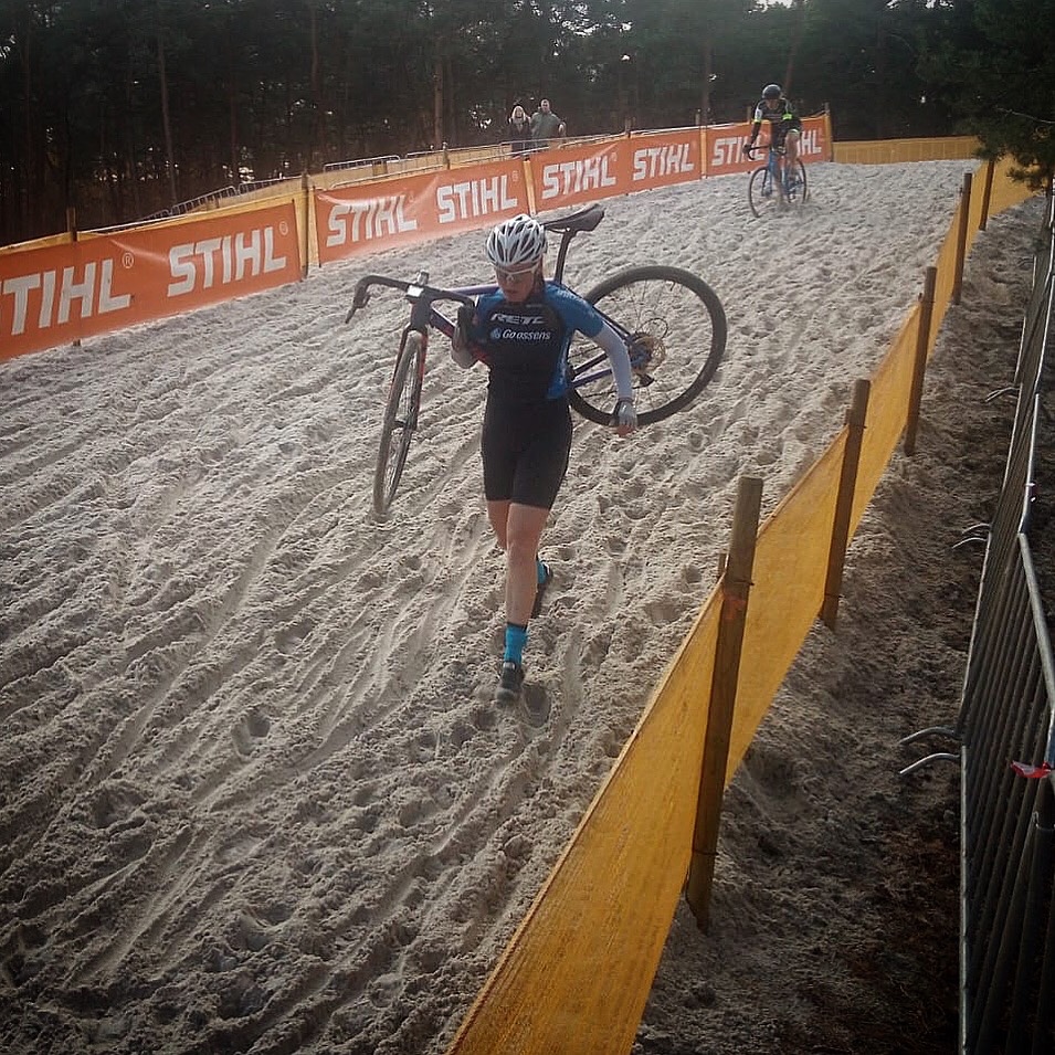 Een specifieke renster wist me mateloos te irriteren met het feit dat ze tot twee keer toe in een zandstrook voor me op de grond ging liggen. De eerste keer kon ik haar passeren en enkele meters pakken door het op een lopen te zetten, terwijl zij met haar fiets lag te worstelen. Zij bleek echter een fantastische hardloopster. Ze rende toen ze eenmaal haar fiets had uitgegraven iedereen in die zandbak voorbij, waarna ze vlak voor me weer op haar fiets hupte. Bij het volgende stuk strand ging ze direct weer op haar plaat, waarbij ze dit keer de doorgang blokkeerde. “Gaot toch uut de weg!” Daar was weinig Nederlands meer bij. Ik realiseerde me dat de mate van mijn frustratie was af te meten aan mijn accent en ik lachte mezelf uit. Dit was wat ik nodig had om uit die destructieve modus te komen. Ik had dit KNWU-trainster Mandy Beumer in Wijchen al meerdere malen tegen renners horen zeggen als er iets misging: “Dat is cross. Niet in blijven hangen. Laat los en door!”