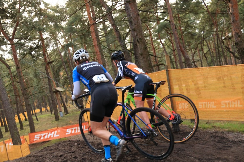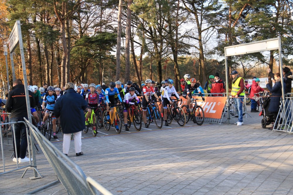 Drie categorieën vrouwen stelden zich achter elkaar op: eerst 35-39, gevolgd door 40-44 en helemaal achteraan stond ik tussen 45-49. De ruim dertig vrouwen gingen allen tegelijk van start. Ik was meteen goed weg, ook al moest ik direct al om de dame voor me heen sturen, die weg wilde fietsen als bij een gemiddeld verkeerslicht. Nog voor we het veld indraaiden had ik in alle hectiek al twee aanrijdingen omzeild, waarna ik wat meer de ruimte kreeg. “Zevende!” hoorde ik Jaap Jan roepen. Dat zou betekenen dat ik ongeveer op de helft van het deelnemersveld van mijn eigen leeftijdscategorie reed. Ik had nu een uitgangspunt om te rekenen mocht ik vrouwen passeren of gepasseerd worden. Alle rugnummers 41 of hoger waren in dat opzicht van belang, de rest reed voor een andere categorie.