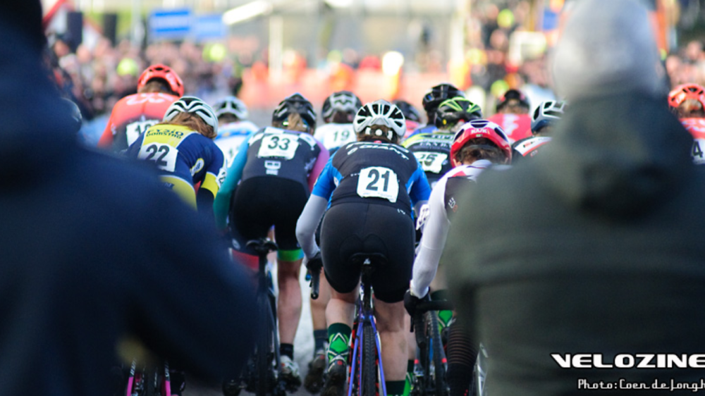 “…34 Vos… ” Het oproepen om te gaan opstellen is begonnen. Eerst worden de vrouwen met een UCI-ranking genoemd, daarna volgt de rest. Mijn naam zal als een van de laatsten worden opgelezen. Ik voel me op een vreemde manier bijzonder kalm, alsof het doodnormaal is dat ik een wedstrijd ga rijden met Marianne Vos, Ceylin Del Carmen Alvarado en Lucinda Brand. “… 21 Neijenhuis…” Ik schuif naar de opening in de dranghekken richting startvak. Terwijl een van de officials onder mijn jackje mijn nummer checkt, neemt een ander de maat van mijn banden om te controleren of ze de maximale breedte van 33 mm niet overschrijden. Ik mag door en positioneer me op de laatste rij, iets links van het midden. Bij de verkenning van het parcours had ik gezien dat we na deze tamelijk lange startstraat middels een vrij ruim uitgezette bocht naar rechts het veld zouden indraaien. Zoals bij drukke stationstrappen en skiliften verwacht ik dat de buitenbocht de meeste snelheid zal kunnen behouden. Er volgt een bijna gezellig gedoe met tasjes en jasjes doorgeven naar de zijkanten. De ouders van een van de rensters willen wel op mijn rugzak passen, waar ik heel erg blij mee ben. Een zenuwachtige stilte voor de start, waarin de speaker ons er nog even aan herinnert dat het om het rood-wit-blauw gaat vandaag. En we zijn weg!