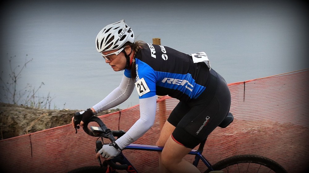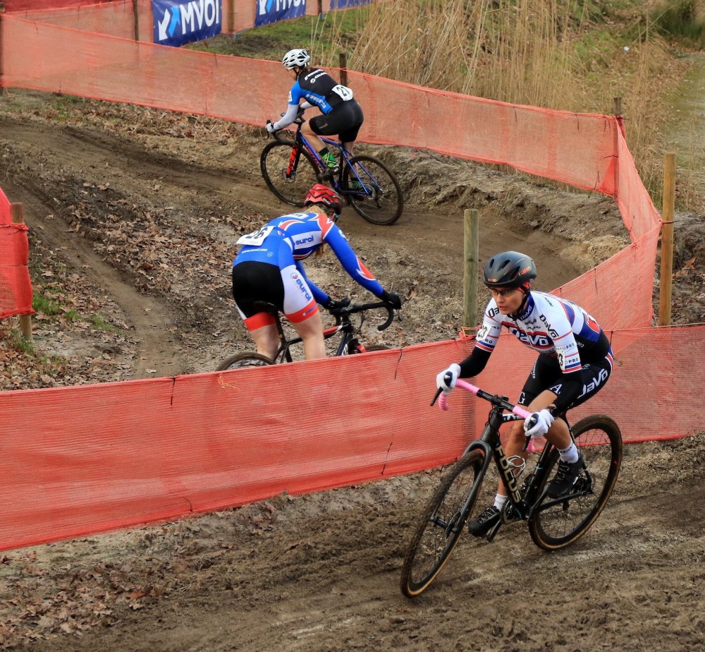 Bij het inrijden en verkennen had ik het al gemerkt: vandaag beschik ik jammergenoeg niet over de set benen van de wedstrijd van vorige week, wat niet verrassend is na deze intensieve werkweek met veel staan. De grillige harde wind en diverse pogingen gaten te dichten zullen snel hun tol gaan eisen. Mijn gekwetste knie daarentegen is goed te doen; die voel ik met deze hoge hartslag alleen een beetje op de anderhalve trap die het parcours rijk is, wanneer ik op enkele steilere gedeelten met kracht mezelf naar boven moet werken en in het kleine stukje dikke bagger bij de materiaalzone. De rest van het parcours is het prima doortrappen. De regen, die mijn heenreis met de auto tamelijk vermoeiend had gemaakt, heeft Rucphen amper aangedaan. Het parcours begint na twee dagen koersen wel een beetje uit elkaar te vallen. Vooral in bochten met hoogteverschil is er over de ideale lijn vaak een gleuf ontstaan, waar precies een band in past. Er valt nog wel omheen te sturen, maar dat levert bizar ruime of juist ongemakkelijk krappe bochten op.