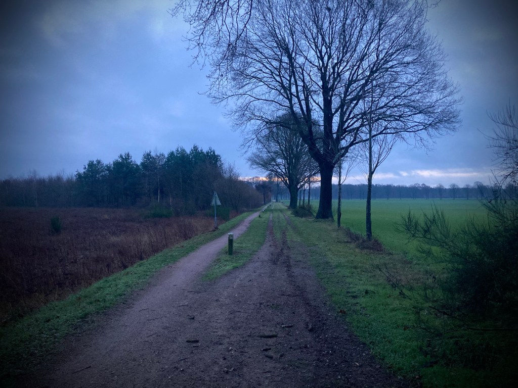 Langzaam wordt het lichter en mijn wereld wordt groter. Ik zie opeens dat de omgeving waarin ik me bevind zich aan me openbaart. Weiden, een zandpad, het typische coulissenlandschap. Ik vind dit een van de mooiste momenten van de tocht. Het wordt nu voorlopig alleen maar lichter en het voelt of alles beter wordt. Ik knip mijn koplamp uit.