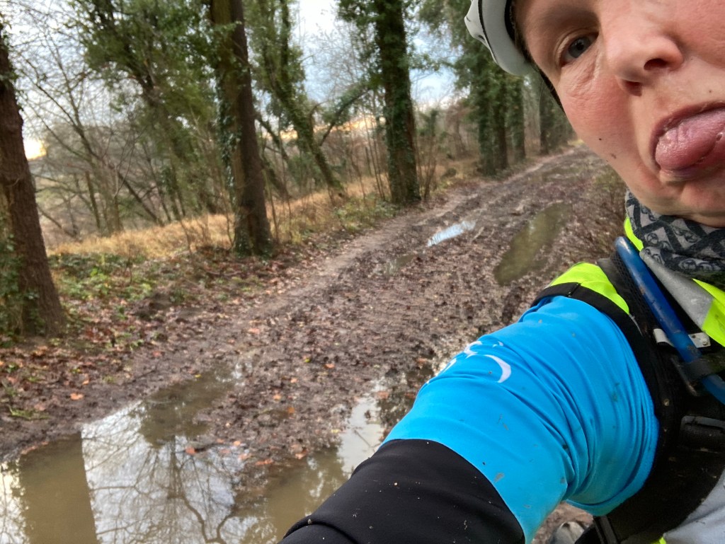 Toch gaat het prima. Mijn benen voelen goed. Ik vermaak me uitstekend. De route is mooi en afwisselend. Er is modder, soms diepe drek, glibberige bospaden, vol water gezogen zandstroken, drogere kerkenpaden met gravel, onverharde paden met grote plassen. Zo nu en dan is er een stukje verhard met klinkers, keien, betonplaten en sporadisch een stukje asfalt. Ik fiets door bossen en bosjes, langs hei en weilanden, bij boeren over het erf en langs kastelen, over karresporen en stukjes mountainbikeroute. En ja, ik tuin er bij daglicht voor een tweede keer in: een ondergelopen waterkant. Ik moet een meter of twee met mijn fiets op de nek bijna loodrecht omhoog klauteren om het aan mijn rechterzijde gelegen akkerland te bereiken als ik wederom in de situatie ben beland dat water de volledige waterkant heeft geannexeerd. Eenmaal bovengekomen is er rechts tamelijk onbefietsbaar akkerland met diepe in de klei getrokken voren en links ligt twee meter lager die tot rivier gepromoveerde sloot. Daartussen is er een enigszins berijdbare strook van nog geen halve meter breed. Het ziet er spannend uit. Ik zie aan een spoor in de modder dat iemand me is voorgegaan en ik waag het erop. Het voelt als langs het hek van ‘Veld 9’ bij een CX-training. Ver vooruit kijken, naar het eindpunt, vooral niet naar opzij en zéker niet naar links. Het lukt! Wel inmiddels alwéér natte voeten.
