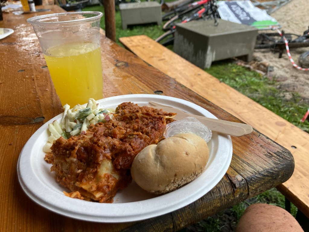 Het lijkt of opeens de nacht is ingevallen, zo donker wordt het in het bos. In de verte is gerommel hoorbaar. “Nog drie kilometer!” roept een klein meisje me toe, terwijl ik met toch inmiddels enige moeite over de slingerpaadjes stuur. Alweer boomwortels. Daar heb ik nu echt geen zin meer in. Vooral mijn ribben protesteren als ik een slechte lijn kies. Tot twee keer toe mis ik een pijl. De scherpte is er wel af, maar ik wil toch een beetje blijven doortrappen om voor het onweer gefinisht te zijn. Ik voel me enigszins opgelucht als ik over de grindpaadjes van het Landal Park “Het Land van Bartje” rijd. Het moet me lukken! Bij wijze van finish rijd ik het podium in de trailer op en weer af. Ik hoor dat mijn naam wordt omgeroepen door de speaker. Inge is binnen! Ik krijg een medaille, twee muntjes en een flesje kettingwax aangereikt. Net als ik voor de munten iets te drinken en een bord lasagne heb gescoord, barst het onweer los. Het finishterrein krijgt een flinke windvlaag en een bak water over zich uitgestort, waardoor alle aanwezigen besluiten dat die anderhalve meter nu even minder belangrijk is dan een schuilplaats. Ik vind een plekje waar ik min of meer droog en veilig mijn versnaperingen kan nuttigen en zicht heb op mijn CruX. “Heb jij dáár die 203 kilometer op gedaan!?” Deze vraag, uitgesproken met verbazing en ontzag, maakt me op dat moment toch een beetje trots. “Ja.”