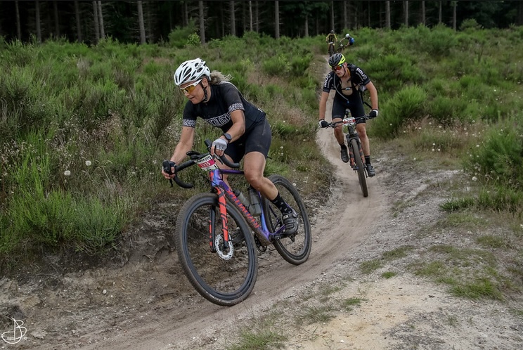 Intussen zit ik me uitstekend te vermaken. Vooral op het stuk over heide met zandvlakten zit ik enorm te genieten van zowel de omgeving als hoe het voelt op mijn fiets. Van elke zandbult maak ik in mijn hoofd een zandstrook in een veldrit en bij de singletracks oefen ik heel bewust het ‘lijntjes tekenen’ om mezelf bij de les te houden. De regen die vanmorgen vlak voor mijn start nog gestaag uit de hemel viel, lijkt helemaal verdwenen en de zon laat zich even zien. Het is bijna niet voor te stellen dat over enkele uren de aangekondigde onweersbuien zullen losbarsten. Na de laatste van vier prima verzorgde pauzeplaatsen voel ik wel dat het goed is dat het nu niet al te lang meer duurt. Mijn benen kunnen nog best een stuk trappen, maar ik merk dat mijn hoofd een beetje klaar is met het voortdurende focussen. Ik maak steeds meer kleine foutjes, waardoor ik mijn gekwetste rib en mijn inmiddels een beetje overwerkte buikspieren ongemakkelijk begin te voelen. Ineens verdwijnt de zon en wordt het serieus donker in het bos.