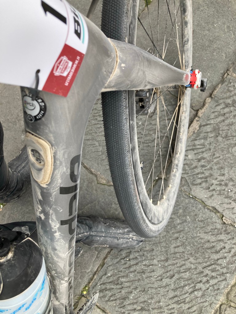 Ik heb geen vergelijk met de eerdere edities, maar deze editie heeft meer gravel dan de voorgaande. Ik vind de langste gravelstroken fantastisch! Vaak zijn er prachtige vergezichten, maar tegelijkertijd is dan te zien hoe er een eindje verderop weer een stevig stukje klimwerk aan zit te komen. Momentum houden is van belang, maar in drukte niet altijd mogelijk. Inmiddels moet rekening gehouden worden met deelnemers die omvallen of zelfs de gehele klim gaan lopen. Mijn bovenbenen doen pijn. Doordat ik niet nog kleiner kan schakelen en niet kan gaan staan zijn de steilste stukken verworden tot een krachttraining. Harken en duwen. Ik ben blij met mijn keuze voor de Cannondale Synapse. Mijn Specialized CruX heeft maar één voorblad en zou me toch tamelijk beperkt hebben in de te kiezen verzetten. Nu heb ik met 52-36 voor en 11-32 achter alles gebruikt. De tubeless 30 mm Schwalbe G One Speed banden doen het prima. Geen lek, genoeg grip op gravel, maar ook lekker rollen op het asfalt, waaruit toch zo’n tweederde van de tocht bestaat.