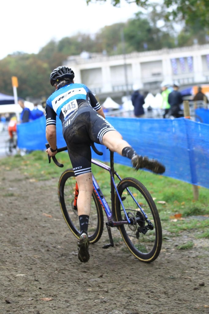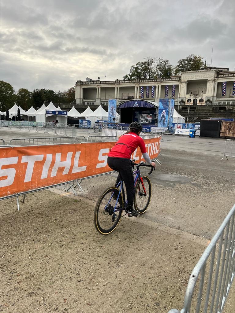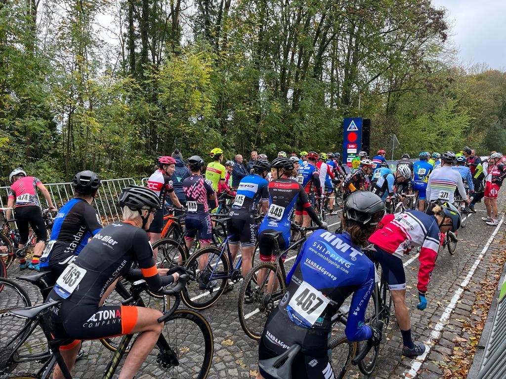 Heel even kijkt hij me vragend aan, maar dan realiseert hij zich dat het signaal dat hij op zijn iPad ontvangt afkomstig is van de magnetische bidonhouder van Fidlock. Nee, er zit geen motortje in mijn CruX, maar als er een cyclocross-parcours is waar dat zou kunnen helpen, is dat zeker hier in Namen. Als ook banddikte en rugnummer zijn gecontroleerd, mag ik als een van de eerste dames aansluiten bij de inmiddels opgestelde mannen. Ik ga het gewoon doen vandaag: starten op de Europese Kampioenschappen Cyclocross voor de masterscategorieën op het beruchte parcours hier op het citadel. Reacties uit mijn sociale fietsomgeving wat betreft mijn deelname varieerden van “Wauw, cool!” via “Dat parcours is toch veel te hoog gegrepen voor jou…?” tot “Hou alles heel.” Ergens die dag heeft iedereen wel een keer gelijk gehad.