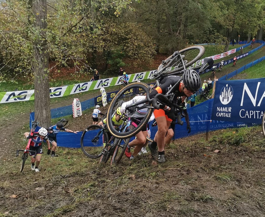 Bij de laatste steile helling vlak voor de finish word ik gepasseerd door de koploper van een van de herenwedstrijden. Mijn EK eindigt daardoor net zo chaotisch als mijn eerste regionale cross dat ooit deed. Bij de finish weet men heel even niet of ik nog door moet of dat ik moet stoppen en ik krijg tegenstrijdige aanwijzingen. Als ik het bochtje naar rechts maak en het stoepje op hop voor mijn volgende ronde, word ik toch tegengehouden. Mijn avontuur is tamelijk plotseling over. Een momentje ben ik hierdoor van slag, maar al snel overheerst het fantastische gevoel. Ik heb het gedaan! Ik heb een crosswedstrijd gereden op het citadel van Namen. En hoe! Ik kan dingen.