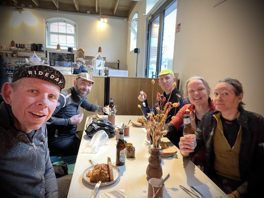 Weeronline laat zien dat het lenteweer dat we voor zaterdag besteld hebben, niet geleverd gaat worden. In plaats daarvan wordt ons een zeer natte dag beloofd met een stevige wind. Afgezien van een geval buikgriep reizen we toch met negen af naar Jorisbrood in Ede, alwaar we worden ontvangen met koffie en wat lekkers. Met gemengde gevoelens starten we aan ons avontuur: 185 km gravelen over de Veluwe in pestweer.