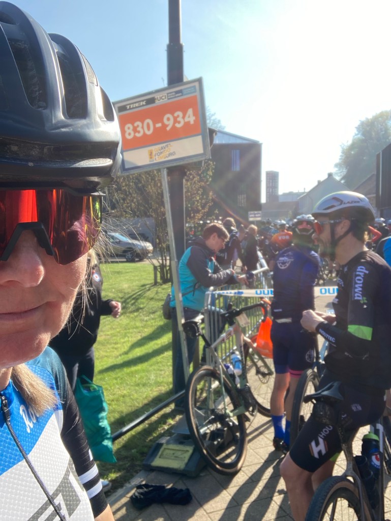 Een uur voor de start van 9:30 uur gaan de startvakken open. Met zowel nummers als kleuren wordt duidelijk aangegeven waar ik met mijn nummer 836 moet zijn en ik zoek een plekje in de zon tussen de anderen met een oranje startnummer. Omdat de mannen en de vrouwen van dezelfde leeftijd door elkaar staan is het eigenlijk nu al lastig om te zien waar mijn concurrentie zich bevindt, maar dat wordt direct nog heel veel erger als de linten tussen de startvakken worden uitgehaald. Ik heb een déjà-vu naar de Hel van Groesbeek waar ik dit ook niet tof vond. Ik frummel maar wat mee naar voren. Als ik niet verder kan, voel ik hoe een man met een wat oudere crosser een paar keer hard tegen mijn derailleur bonkt. Inmiddels zie ik om me heen allerlei kleuren startnummers en heb ik geen idee meer of oranje vrouwen voor of achter me zitten. En dan moeten we de startstreep nog passeren.