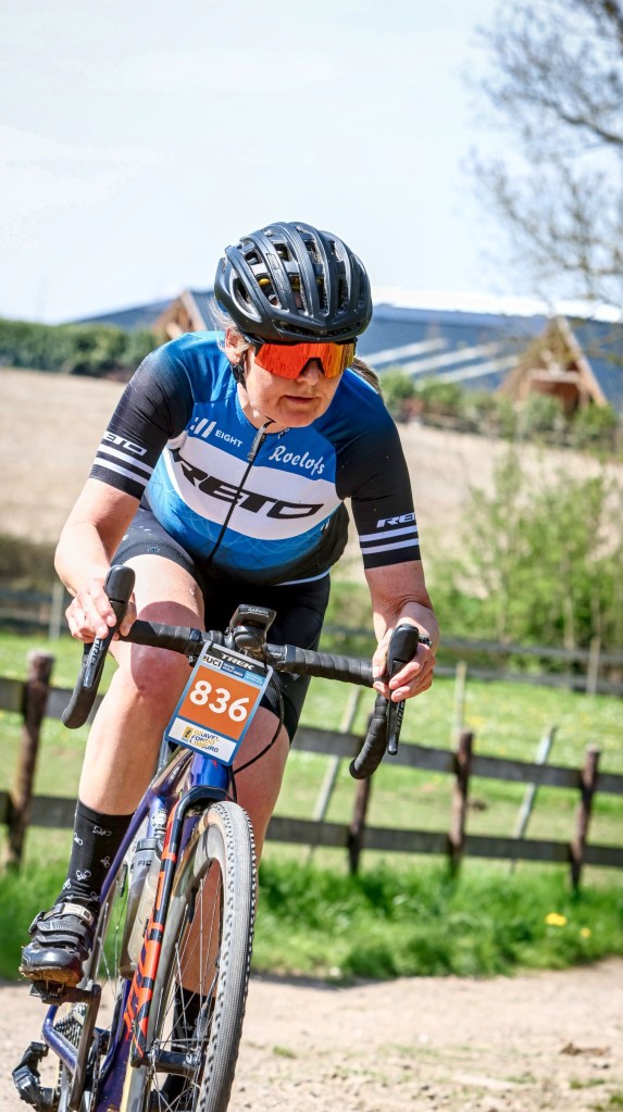 De rust heb ik nodig, want ik ben veel te gespannen voor hetgeen ik me nu weer zonder goed na te denken voor heb opgegeven. Mijn onzekerheid of ik wel met mijn crosser op het parcours uit de voeten kan, wordt gelukkig weggenomen als ik die middag nog even samen met Brenda een ronde kan verkennen. De ombouw met de SRAM RED XPLR eTap AXS achterderailleur met een 10-44 cassette in combinatie met een 42T voorblad blijkt een prima set-up voor de Limburgse heuvels. Het deel rond de Keutenberg is nogal hysterisch op en af, met hotseknots-afdalingen en ergens een klim met boomwortels. Tijdens de verkenning kan ik daar prima fietsen, maar ik vrees dat het met de drukte van ruim duizend deelnemers lopen wordt in de eerste ronde. Daar maak ik me nog het meest druk over: ruim duizend fietsers, die frummelen en frotten, onbesuisd langs me heen komen dalen of onverwachts voor me op het grind gaan liggen. Ik weet dat ik er geen invloed op heb en probeer de ‘ik ben niet aan de beurt’ mantra van Milaan-Sanremo te activeren. Dat lukt maar matig.