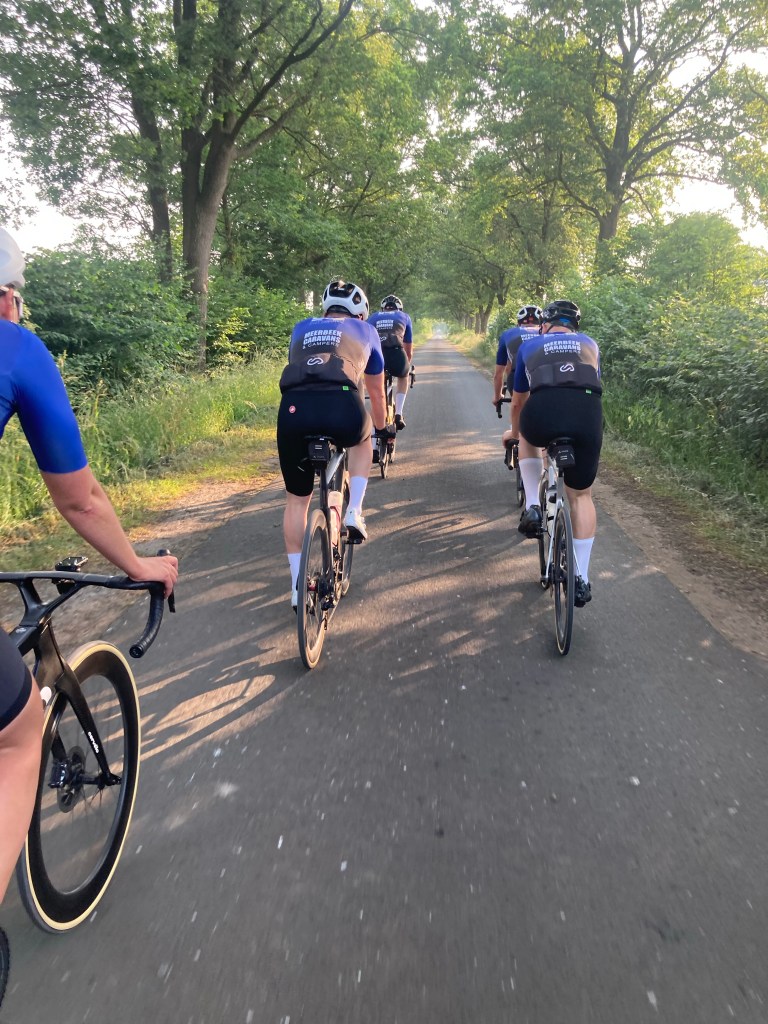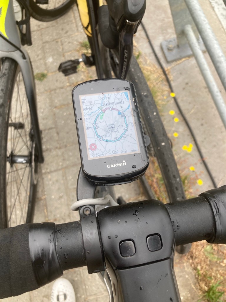 Met zonnebril op is het nog best donker, maar gelukkig komt de zon ons snel helpen. De tegenwind is ook wakker, maar op dat moment nog alleszins te doen. Er wordt een steady tempo aangehouden en we doen allemaal netjes ons deel van het werk. We hebben een fijn stel mensen bij elkaar om dit mee te gaan doen vandaag. Dit draait prima! We hebben wat vervelende Duitse fietspaden en denderen dwars door een nog slapend Düsseldorf, maar de route is soms ook verrassend mooi. We rijden over rustige weggetjes in het groen, soms met slecht wegdek en een enkele keer trotseren we een serieus gravelstrookje. Op de klimmetjes richting Havixbeck, waar we onze eerste stop zullen houden, zit ik me uitstekend te vermaken. Ik heb wel prima benen eigenlijk, maar ik hou bewust in: doseren vandaag. Bij de bakkerij aan de koffie bedenk ik me dat we nu op een plek zitten, waar we normaal met de auto heen gaan om een route te rijden. Nu zijn we er op de fiets. Ik zal me dat vandaag nog vaker bedenken.