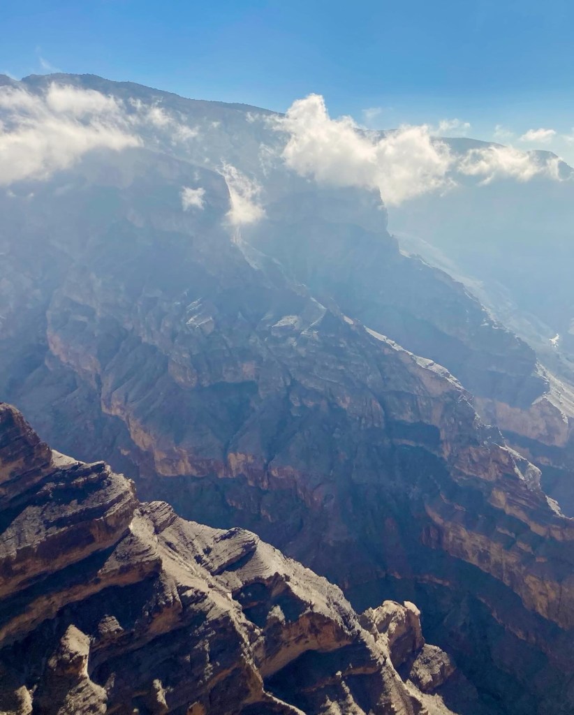 En dat laatste doe ik met volle teugen. Van elke minuut van deze reis, ook die laatste minuten van etappe twee, waar de kilometerslange onverharde klim langs de wadi Damm zorgt voor pijn en uiteindelijk zelfs kramp in mijn pootjes. Want wat is het prachtig, hoe wij vanaf de op 2000 meter hoogte gelegen weg over de bergkam in de door de ondergaande zon belichte mistflarden bij onze volgende accommodatie aankomen. Dit is echt een koninginnenrit in heel veel opzichten, maar niet per se de mooiste etappe. Op de een of andere manier zit onze reis zo in elkaar dat het voor mijn gevoel elke dag nog weer mooier wordt. We zien heel veel steen, maar de variatie is ongekend. Ik houd van het desolate van dit soort landschappen. Het is als bovenop de Mont Ventoux: ik voel me overal aanwezig en nietig tegelijkertijd. Het contrast met de weelderige begroeiing, zoals bijvoorbeeld in Misfat, waar we ook een overnachting hebben, vind ik fascinerend. Binnen één etappe varieert het van verre uitzichten over bergtoppen tot diepe kloven met rotswanden die naast ons loodrecht omhoog torenen. Het regenwater van bij onze aankomst maakt dat we tot aan het einde van onze reis in de wadi’s door water heen mogen fietsen. Heerlijk! Natte voeten zijn niet erg, die zijn in een oogwenk weer droog. We fietsen hier in februari in een aangenaam zonnetje in kort-kort.