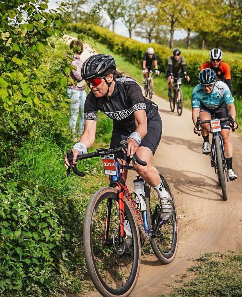 Heb ik er zin in? Eigenlijk niet. Door allerlei gedoe heb ik me minder goed kunnen voorbereiden dan ik gewild had. Toch vind ik het mooi om eenmaal in het startvak een aantal gravelvrouwen weer terug te zien en krijg ik wel wat kriebels om er toch een mooie race van te gaan maken. Er is veel hetzelfde als in 2023, maar er zijn ook wat zaken anders. Het parcours dat ik niet verkend heb, is hier en daar wat gewijzigd, maar de start is nog steeds ‘vanuit stilstand de Cauberg op’. Dat gaat deze keer verrassend oké. Ik heb mijn klimbenen mee. Dat is maar goed ook, want op het plateau maken we kennis met een factor die nogal anders is deze editie: een bizar harde wind. Nog voordat we naar rechts het veld in draaien, breekt het lint van renners dat voor me rijdt in stukken en stukjes. Het wordt een koers waarin ik uiteindelijk verrassend meer gesloopt word door de wind dan door het klimmen.