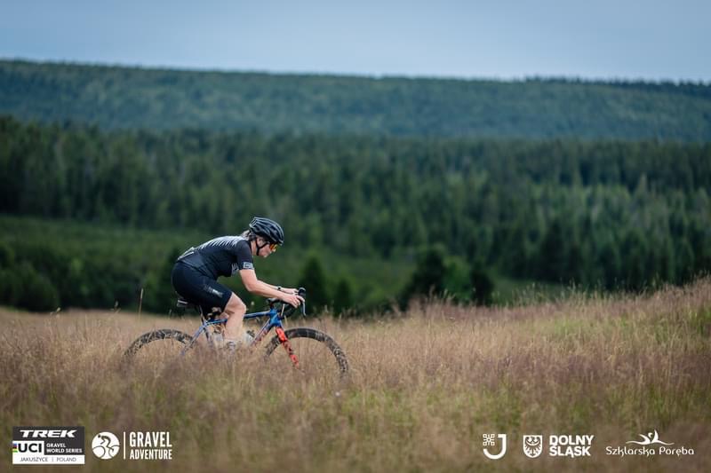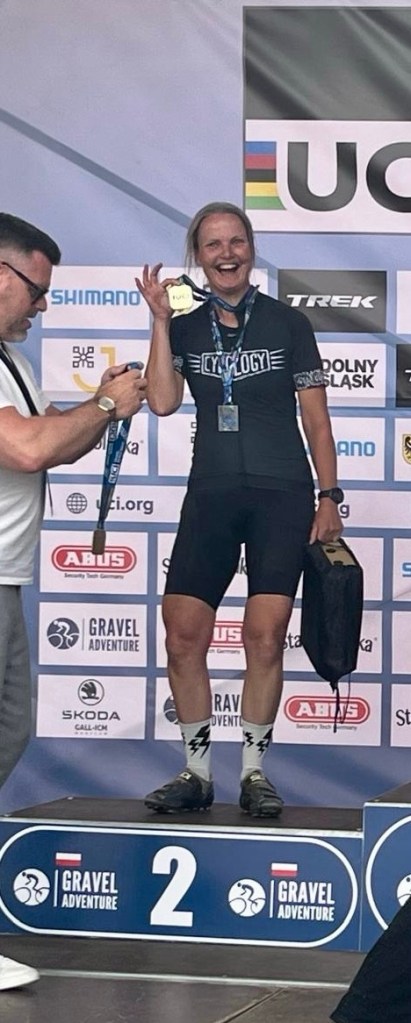 Vlak voor een klim van maar liefst zeven kilometer over slecht asfalt is een lange technische en hobbelige afdaling met veel grote keien, waar ik op mijn CruX alle zeilen moet bijzetten, maar ik vind dat ik het best prima doe allemaal. Op de lange klim pak ik veel posities terug, maar helaas nog niet de Duitse dame met het oranje nummer. Ik blijf gasgeven, ook op het hierop volgende prachtige open gedeelte met schitterende, glooiende gravelpaden, waar ik inmiddels doordat het deelnemersveld heel erg uit elkaar ligt het idee heb dat ik bezig ben met een tijdrit op gravel. De Duitse kan pech krijgen of inkakken, dus blijf gaan! Zo nu en dan tref ik steeds opnieuw dezelfde Poolse dame uit een andere categorie, die netto ongeveer even snel het parcours aflegt als ik, maar in een compleet ander ritme. Vanaf de laatste steile klim maken we er samen onderling een strijd van: ik klim sneller, zij daalt het gat dicht, ik steek binnendoor als we het stadion binnenrijden, zij wint de eindsprint. Ik voel het dan ook overal in mijn lijf: keurig de tank leeggemaakt. Opnieuw mag ik naar het podium voor een UCI-medaille en voor een prachtige zilveren medaille van deze organisatie in het Poolse Jakuszyce.