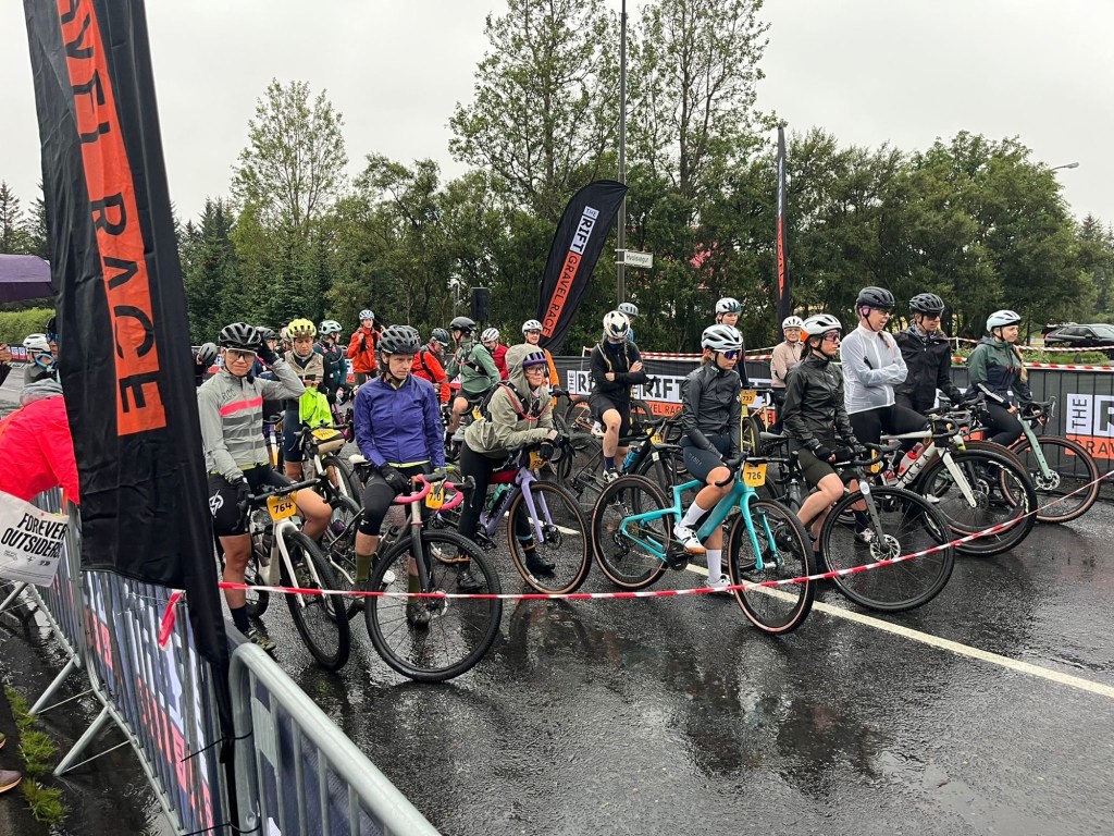 Murphy’s ‘wet van behoud van ellende’ toont zijn geldigheid als we vlak voor de start constateren dat het vrijwel windstil is vandaag, wat tamelijk bijzonder is op IJsland, maar dat het daarvoor in de plaats gestaag regent. Dit zal de eerste uren van onze wedstrijd aanhouden. Er heeft dan ook niemand haast om in het startvak te gaan staan. Pas tegen kwart voor zeven, een kwartiertje voor de start van de dameswedstrijd, stellen de eersten zich op. We zijn in totaal met 88 ingeschreven vrouwen, 32 dames voor de elite-wedstrijd en de rest, waaronder Manon en ik voor de ‘200-open’. De eerste kilometers over het asfalt zullen we geneutraliseerd gaan afleggen. Daarna moet er gelijk geklommen worden, waardoor we al snel op onze plek zullen komen, zo is mijn verwachting. Ondanks mijn voorbereidingen heb ik eigenlijk geen idee wat me precies te wachten staat. Ik heb mijn regenjackje aan voor het eerste stuk in de regen en mijn merinowollen sokken voor de ijskoude rivercrossings. Ik heb een waterzak op mijn rug, twee bidons met elektrolyten in de houders en voor elk uur dat ik verwacht onderweg te zijn iets te eten in mijn zakken. Ik heb een tooltje, binnenband, fietspomp en plugsetje bij me, want onderweg mag er geen assistentie van buitenaf worden verleend. Het parcours is dusdanig dat dit ook eigenlijk amper mogelijk is, want we gaan letterlijk naar een gebied op en rond de vulkaan Hekla ‘where the streets have no names’.