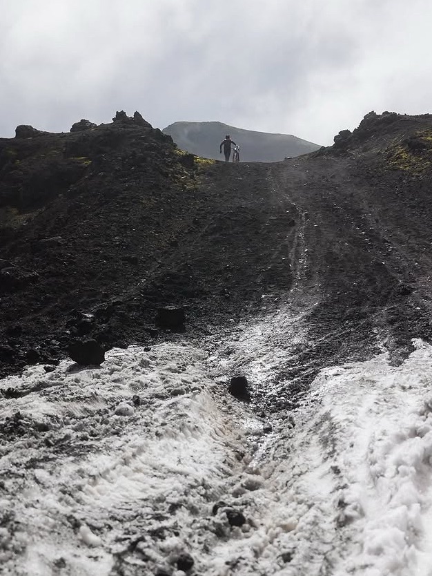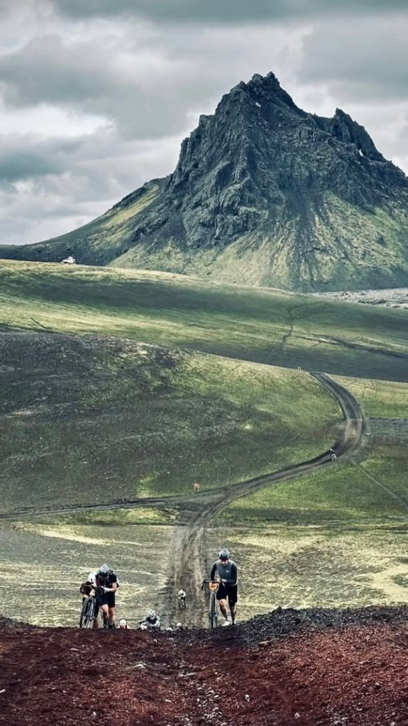 Ik ben blij met wat ondersteuning van mijn navigatie, hoewel bij gebrek aan straatnamen urenlang slechts ‘Hekla’ als aanwijzing in het scherm op den duur wel wat gaat tegenstaan. Die vulkaan is stiekem het uiterste van me aan het vergen. Door de weidsheid van het landschap is inschatten van de gradiënt één grote mindfuck. Sommige stukken zijn bizar steil en in combinatie met de vaak listige ondergrond moet er nogal wat met de fiets gewandeld worden. Ik trek de conclusie dat ik specifiek dit onderdeel echt meer had moeten trainen. Als een crosser met de fiets in de nek hollen is al vrij snel duidelijk geen optie; de MOG is daar te zwaar voor, de ondergrond te slecht en de hellingen te steil en te lang. En het moet te vaak. In een poging om zo min mogelijk te lopen probeer ik mijn problemen waar het enigszins lijkt te kunnen al fietsend op te lossen. Dat gaat op mijn kleinste verzet een aantal keren best goed, maar op een stuk waar het opeens weer vrij druk is en het fietsen slechts kan in een smal spoor naast alle wandelaars, stuur ik wat onhandig om een andere deelnemer heen, waardoor ik met een koprol de lava van heel dichtbij ga bekijken. “Wow, that was an amazing safe!” was de reactie van een renner achter mij, maar ik ben minder enthousiast als ik straaltjes bloed uit mijn elleboog en knie zie stromen. Het ziet er echter vervelender uit dan het is en ik kan door. Vanaf nu ga ik wel al dit soort hellingen direct lopen.