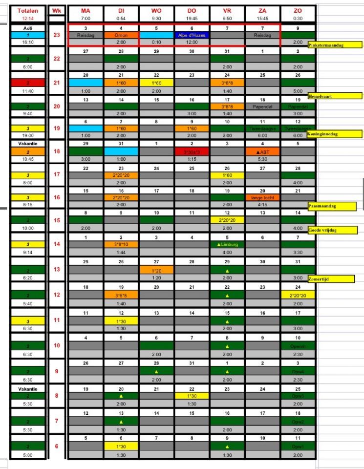 Nee, ik zou dus gericht te werk moeten gaan en het beste zou zijn om dan een schema te maken. Ik heb daar geen ervaring mee, ook al fiets ik al bijna 25 jaar. Gelukkig is er op internet veel informatie over training en schema’s. Ik heb me ingelezen bij de Wielervrienden en bij Doefiets (toen nog Zitvlees geheten). Deze laatste had zelfs een voorbeeld van een voorbereiding op Alpe d’HuZes. Met dat voorbeeld ben ik aan de slag gegaan; mijn eigen data inplannen wat betreft vakanties en drukke perioden op het werk, bijzondere dagen en natuurlijk de week waarin het moest gebeuren. Ook de uitstapjes naar Limburg en Sauerland en de Clubtweedaagse bleken er mooi in te passen. Vervolgens de groene, gele, oranje, rode en blauwe vakjes op een vergelijkbare manier verdelen en voilà mijn eerste zelfgemaakte trainingsschema!