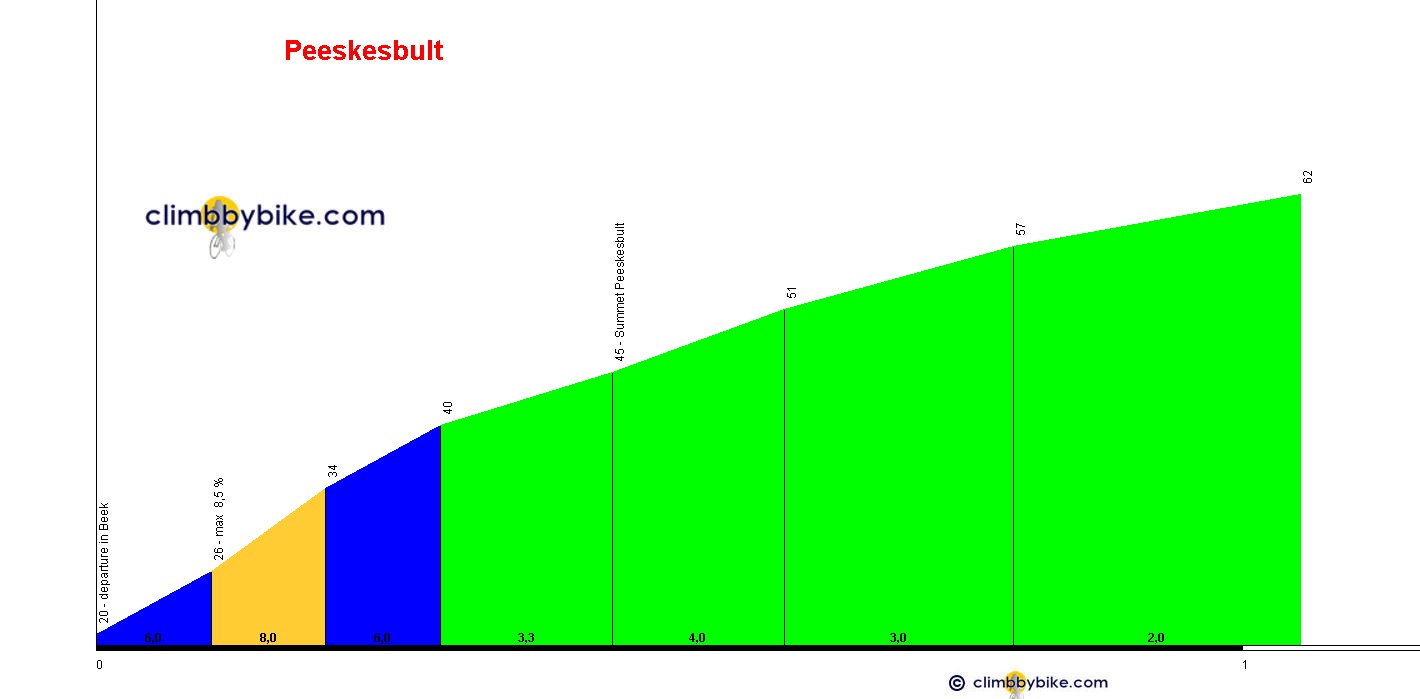 Ik woon in een dorpje aan de voet van het bosgebied Montferland, waar we een klimmetje hebben, dat bekend staat als de Peeskesbult. De klim is een kilometer lang en gemiddeld 4,1%. Dat betekent dat je in die klim 41 hoogtemeters maakt.