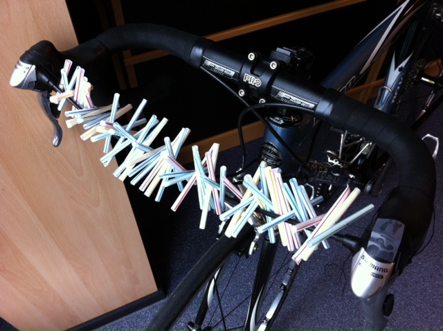Veel mensen in mijn omgeving steunen de actie en vaak op meer manieren dan alleen geld doneren. Ik heb een collega, die mijn correctiewerk voor de examens gaat afmaken, zodat ik weg kan in die week in juni. Mijn vader hangt overal mijn posters op en deelt flyers uit. Een clubgenoot deelt zijn specifieke trainingservaring voor de bergen met mij. Verschillende mensen voeren hun eigen acties voor een donatie. Onderstaande idee is van een collega op de administratie. Dankzij haar actie zou ik uiteindelijk 62 rietjes met namen aan mijn stuur mee naar boven gaan nemen. Dit liet mij echt voelen deel uit te maken van iets bijzonders en maakte dat ik dankbaar was, dat ik als docent en fietser mee kon doen aan ‘Almende d’HuZes’ om dit samen met en voor de collega’s en de leerlingen te kunnen doen…